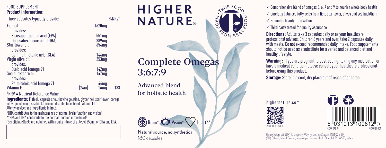 This unique, comprehensive blend of omegas 3, 6, 7 and 9 fatty acids provides carefully balanced ratios in the convenience of capsules, using fish oils from small, wild fish which are screened for quality and purity. This balanced blend provides omega 3 fats in triglyceride form from cold-pressed, unrefined & filtered oils from wild sardines, anchovies and mackerel.